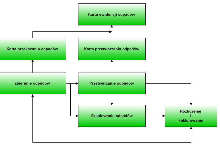Poniższy schemat w bardzo prosty sposób obrazuje najważniejsze procesy i funkcjonalności dotyczące zarządzania odpadami.